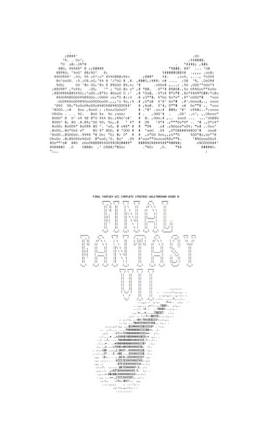 these walkthroughs were often decorated with ASCII art to reflect the game's title design, and here we collect some of the best examples in glorious black and white. marvel as some sort of program -- or a person with a great attention span -- makes a bunch of strategically deployed characters look like a whole-ass thing.