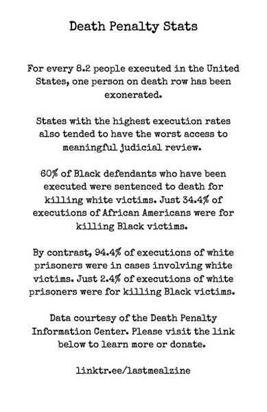 "Last Meal" also includes some relevant death penalty stats and links to other resources and information, because this shit isn't altogether that funny.