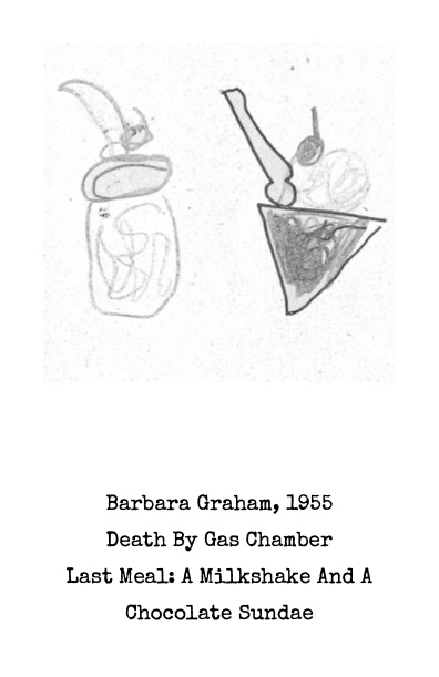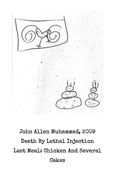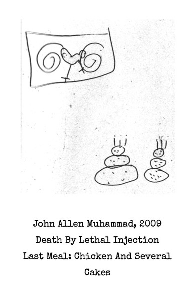 featuring notable last meals illustrated by a 7-year-old, this Wikipedia-sourced zine explores gastronomic finality in the prison-industrial complex. get ready for a lot of lethal injection, hot dogs, "several" cakes and a single, unpitted black olive.